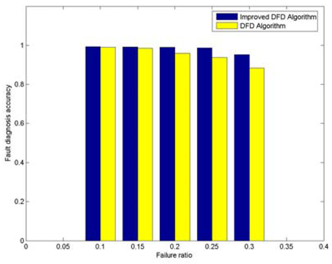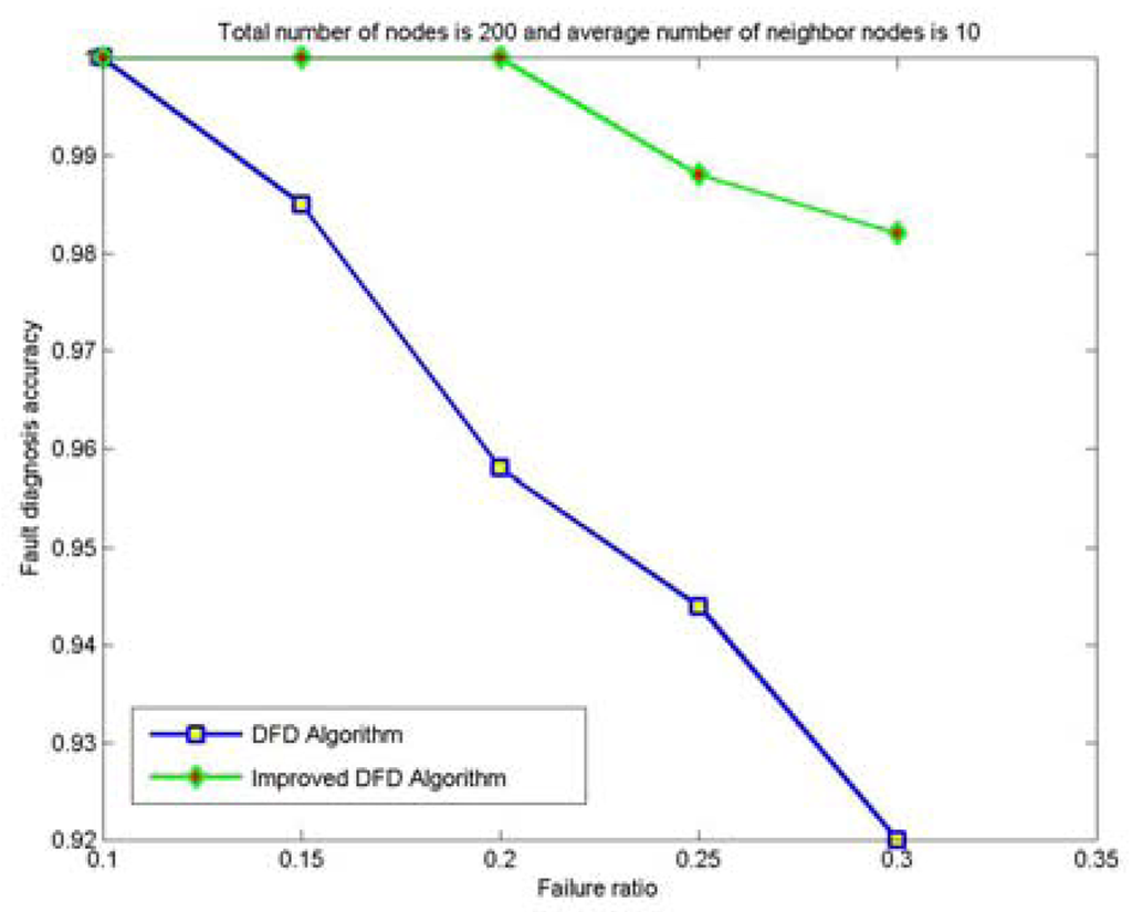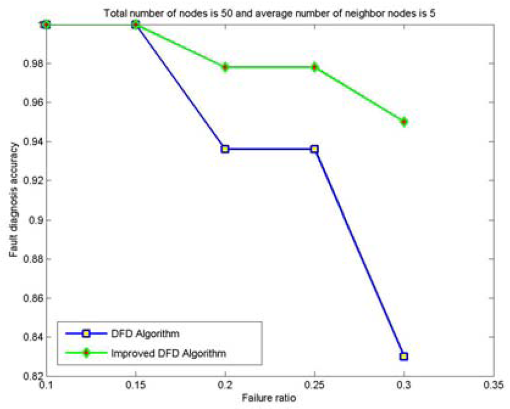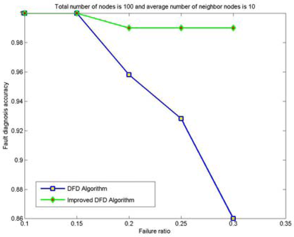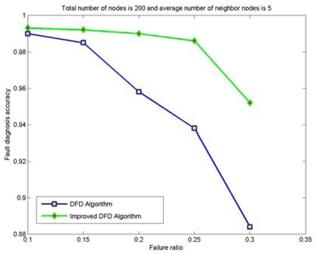 Therefore, compared with the DFD scheme, the improved DFD scheme greatly increases the node fault detection accuracy and high fault detection accuracy can be obtained even with high node failure ratios and small average number of neighbor nodes.