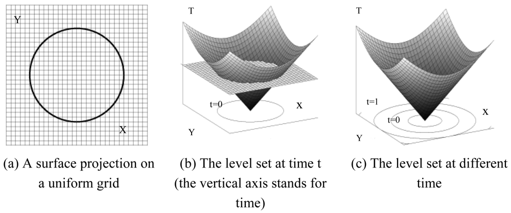 In the level set method, a scalar Lipschitz function, ϕ(x, t) (also known as level set function), defines the embedding of an n-dimensional surface in an Rn+1 space surface, where x ∈ Rn+1, and t = time t (Figure 1). The set of points on the surface, S, are mapped by ϕ such that: