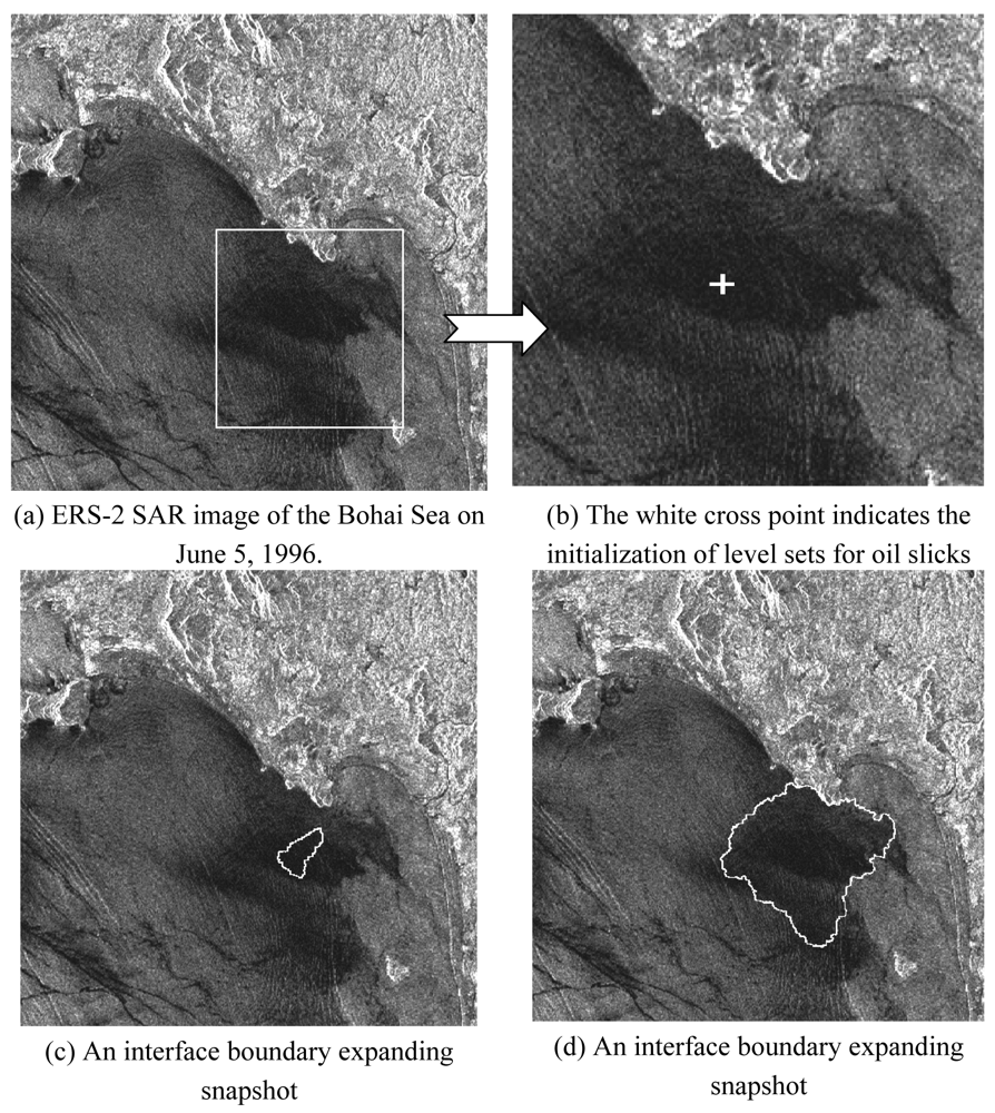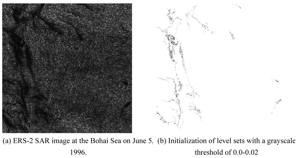 To confirm the efficiency gain of the proposed level set method as shown in Table 1, two 1024 × 1024 pixel SAR images (Figures 5 and 6) of the Bohai Sea recorded on June 5, 1996 were used to segment surface slicks with single and multiple initialization of level sets, respectively. In the first experiment, an arbitrary shape, i.e., a point, was manually defined as a single initial level set, whereas in the second experiment, a threshold was set to obtain multiple initial level sets. Ilower and Ihigh were defined as the lowest and highest grayscale values of the slicks, and were selected according to the grayscale distribution of oil slicks in the radar image. The ratio between the intensity model and the curvature model constrained the smoothness of the evolving surface to prevent some of the leaking that was common in the connected-component structures. If the ratio were equal to 0.0, i.e., only using the curvature model, the proposed method would become the traditional level set segment.