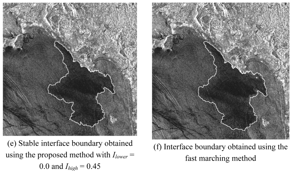 In the first experiment (Figure 5a), the priori information, i.e. zero level set was selected as a single seed in the slick at random shown in Figure 5b. In accordance with the procedure described in the previous section, the SAR image was segmented using the proposed level set method. Considering the grayscale distribution of dark slicks in the image (Figure 5a), the lowest and highest grayscales, i.e., Ilower and Ihigh, were measured and set to 0.0 and 0.45, respectively. In addition, for balancing the intensity and curvature models, the ratio between the former and latter models was adjusted to 50% for Fprop and 50% for Fcurv. The sequence of interface propagation is illustrated from Figures 5c to 5e. It can be found that the interface boundary expands from an initial seed point to a stable boundary. The result using the traditional fast marching method, which only depends on the curvature flow, is also shown in Figure 5f. In the boundary with a distinct change such as coast, both methods arrived at a similar shape, but in the region of slicks with a slowly gradual change, the fast marching method obtained a more smooth but enlarged shape.