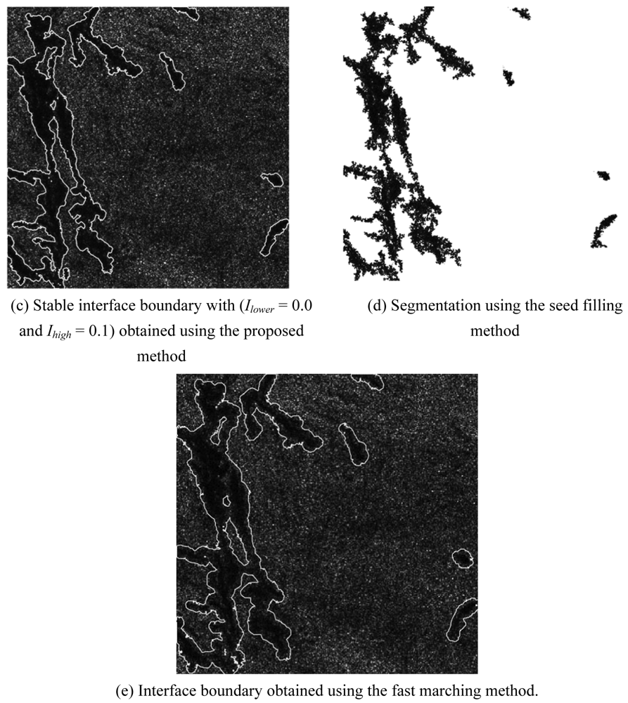 The result for the fast marching method, which only depends on the curvature flow, is displayed in Figure 6e. It can be observed that the proposed method gave a shape closer to the seed filling result than the fast marching method for an oceanic radar image with high noise and low contrast.