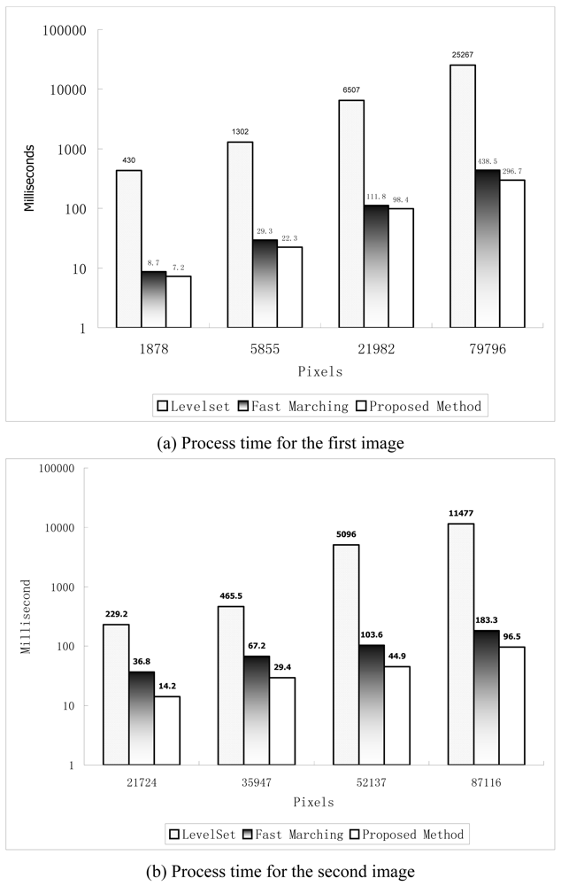 To test the efficiency of the proposed method, it was compared with the ordinary level set and fast marching methods in terms of mean processing time for oil slick patches (Figures 7a and 7b). The experiments were performed on a 2.0 GHz Pentium 4 PC, which has 1 Gbytes of memory, 20 Kbytes L1 cache, and 512 Kbytes L2 cache.