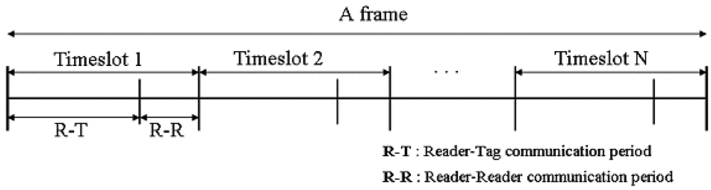 In TDMA based anti-collision algorithms, a reader to reader communication period should exist, because each reader decides its timeslot for transmission through communications between the readers. Figure 1 shows a frame which consists of timeslots and each timeslot is divided into Reader to Tag (R-T) and Reader to Reader (R-R) communication periods. The R-T period is used for reading the tags of a reader and the R-R period is used for the communications between readers. Our algorithm also follows this frame structure.