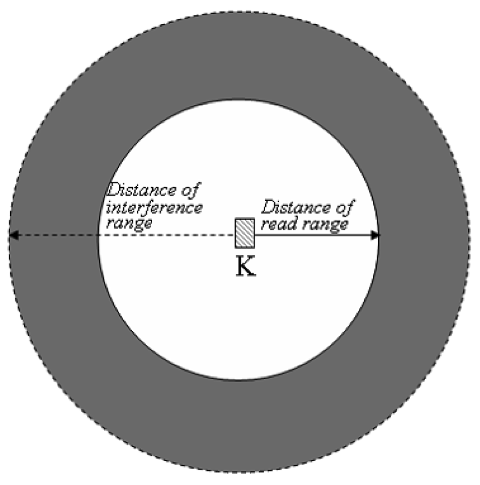 where α is the number of readers, which are located in its read range, ri and rr mean the distance of interference range and read range of the reader respectively.