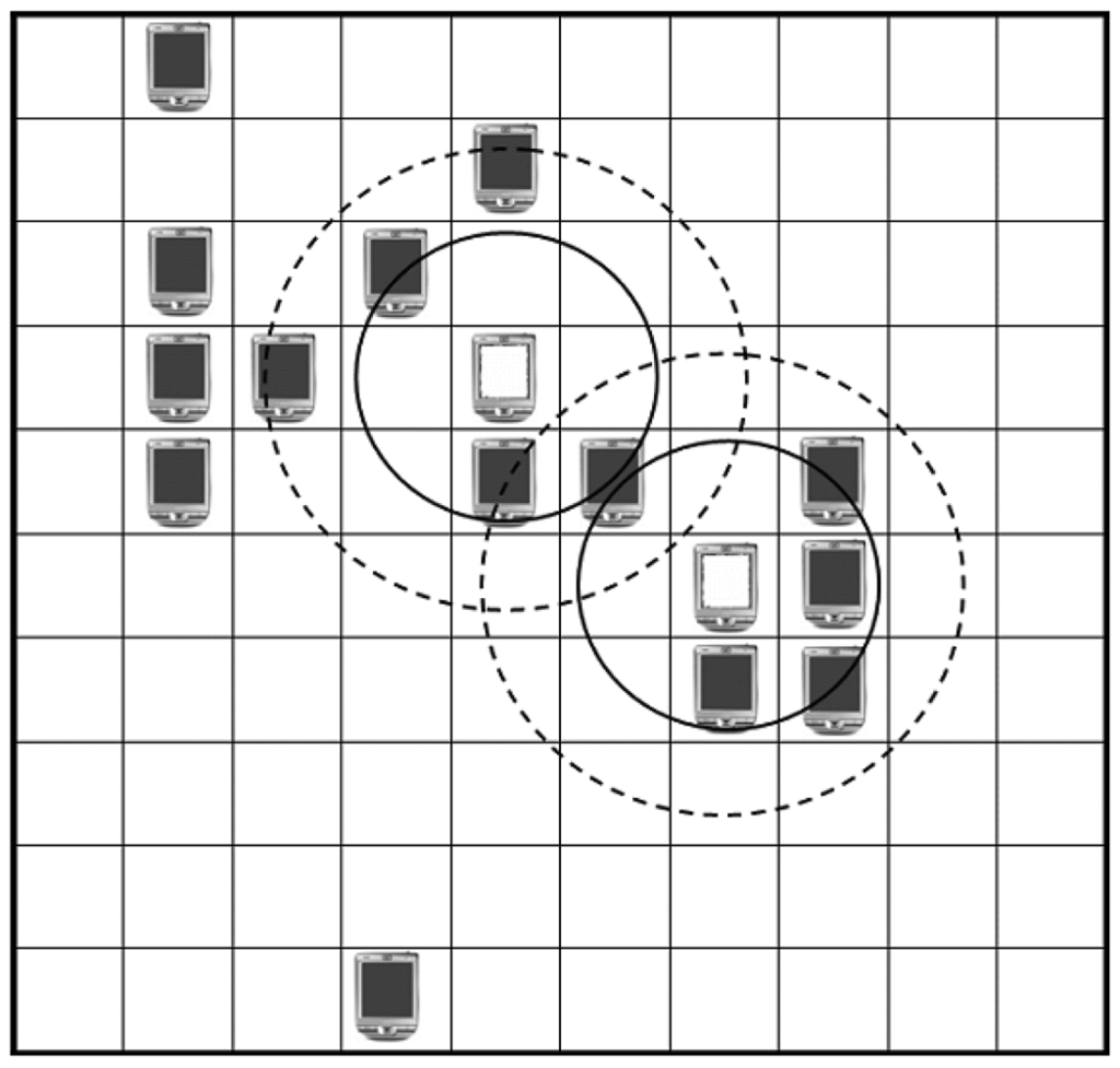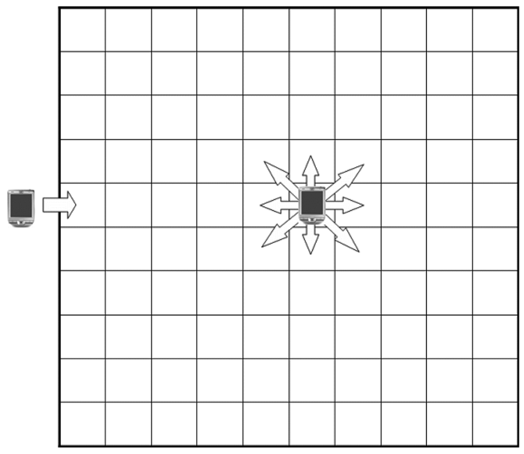 For the experiments on the anti-collision algorithm for Mobile RFID, a simulated 10 by 10 virtual matrix where each cell size is 4 meters by 4 meters was implemented and, in this matrix, the readers had mobility to move anywhere. The simulator was built on the assumption that each RFID reader uses ultra high frequency (UHF) 868-960 MHz whose distance of read range is 3 to 7 meters, according to the signal strength with zero packet loss. We set the distances of read and interference range of each reader as 6 and 8.5 meters respectively such that it could communicate with its eight neighboring readers and interferes with 17 readers in maximum, as shown in Figure 4.