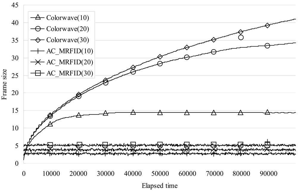 Figure 6 shows the average frame size of the readers per 100 elapsed timeslot_IDs (The marks on the graph are at every 10,000 elapsed timeslot_IDs for the sake of clarity).