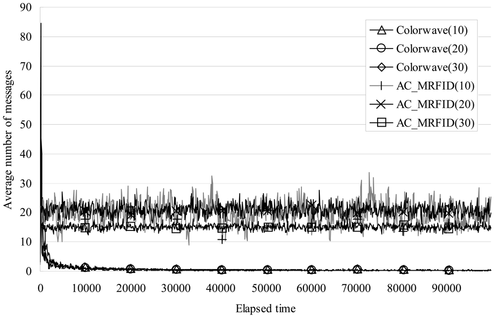 Figure 8 shows the results of average number of broadcasting messages of a reader for reader to reader communication per 100 elapsed timeslot_IDs. As the figure shows, when the test was conducted with 10 and 20 readers, a reader, which adopted AC_RFID algorithm, continuously sent broadcasting messages about 20 times on average per 100 elapsed timeslot_IDs, and with 30 readers, about 15 times on average, while a reader, which adopted Colorwave algorithm, sent broadcasting messages over 80 times in the first 100 timeslot but the number drastically decreased to 0.5 times as times went on in all 3 cases. This results show that AC_RFID algorithm make a reader enable to keep communicate each other continuously to decide its number of timeslots in a frame appropriately. In the sense of energy consumption, though AC_RFID consumed more energy than Colorwave to communicate each other, it would not be a big problem not as like scattered sensor nodes because generally RFID reader devices have ample capacity of batteries which can be recharged as like cell phone or PDA device.