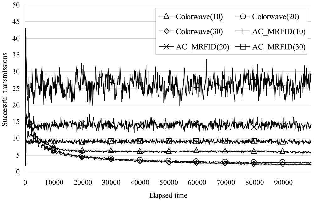 Finally, Figure 9 shows the average number of successful transmissions of each reader without collision per 100 elapsed timeslot_IDs. In the case of 10 readers, our algorithm, AC_MRFID, successfully transmitted between 19 and 33 times. On the other hand, in the first 500 timeslots Colorwave transmitted with a higher frequency than AC_MRFID, but, as time went by, the value decreased to 5.5 times. In the case of 20 readers, our algorithm successfully transmitted between 5 and 22 times, while Colorwave showed better results in the first 1000 timeslots, but as time went by, its value decreased to 2.6. In the case of 30 readers, our algorithm successfully transmitted between 8 and 10 times, while Colorwave showed better results in the first 4400 timeslots but, as time went by, its value decreased to 2.2. The overall average numbers of successful transmissions in both cases are listed in table 3. As Table 3 shows, our anti-collision algorithm for Mobile RFID improves the number of successful transmissions by 228.4% on average compared with Colorwave.