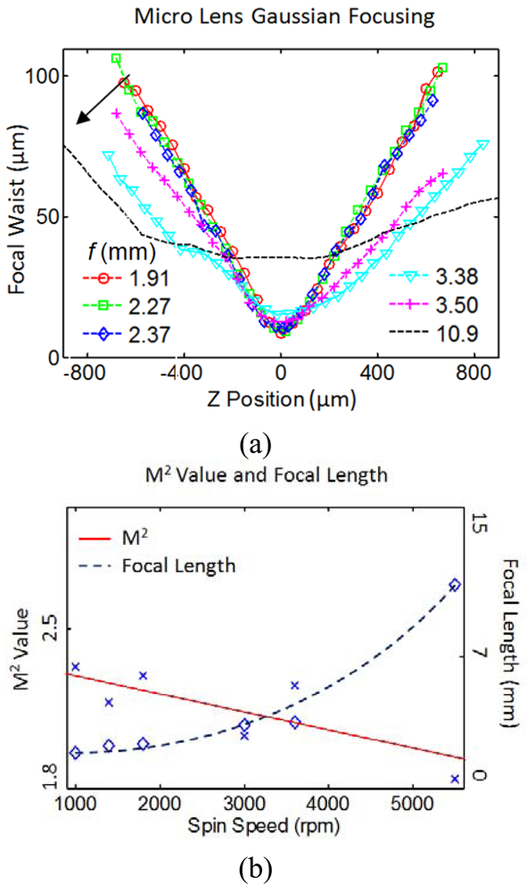 The M2 value measured from 2.5-1.8 and decreased with increasing spin rate (thinner lens, thus lower aspect ratio), suggesting that decreasing initial thickness and aspect ratio promote accurate reflow curvature. On the other hand, though better M2 (1.77 at 5,500 rpm) were attained by thinner lenses, their yield during reflow was lower and produced much longer focal lengths. Other studies [17,18] also show that thinner resist creates deformation during the reflow and suggest the aspect ratio to be a critical parameter in lens formation. Balancing quality and short focus, the microlenses in our MEMS spectrometer are typically fabricated at 3000 rpm speed with initial resist thickness of 34 μm. With this process, the best fabricated microlens obtained an M2 of 1.98 with f of 3.5 mm.