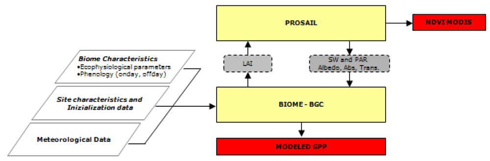 BIOME-BGC was coupled with the leaf and canopy radiative transfer (RT) models named PROSPECT and SAILH [19], respectively, resulting in the coupled model referred to hereafter as PROSAILH-BGC. The objectives of the coupling were twofold: to improve the BIOME-BGC description of the canopy radiation regime and to simulate the NDVI as a function of LAI and overpass characteristics (sensor and sun geometry) of MODIS observations.