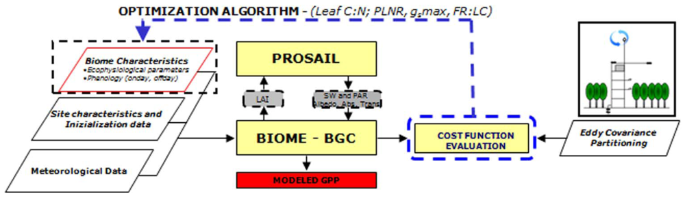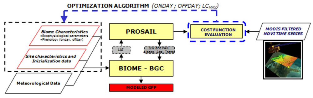 Figure 2. Flow chart of first-step optimization. Yellow blocks represent the models, parallelepipeds represent the model input parameters and the data for model optimization, grey boxes represent the state variables passed between coupled models while the red box is the model output.Model ecophysiological parameters and their relative standard errors were estimated by using a bootstrapping algorithm with N = 500 resampling as described in [49]. The median of the distribution generated by bootstrapping for each parameter represents the estimated parameter value, while the standard deviation is a good measure of the error associated with the parameters. - In the second step we estimated phenological and standing biomass related parameters by inverting the model against remotely sensed NDVI time series. The algorithm determines ONDAY, OFFDAY and LCMAX which minimize the cost function calculated using NDVIMODIS as observation and the NDVIPROSAILH-BGC as modeled data (Figure 3). These parameters were chosen because of their importance for the model application at spatial scale. In fact, process-based models, and in particular BIOME-BGC, are sensitive to parameters describing the development of the canopy such as phenological data and parameters related to maximum LAI [25]. Thus, in this step we evaluate the accuracy of the proposed method in retrieving these important data, usually lacking over large areas.