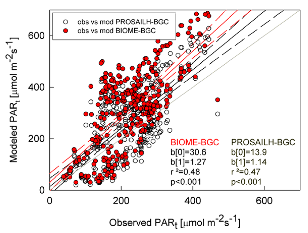 Relationship between modeled and observed PARt. Red circles represent data modeled with BIOME-BGC while white circles represent data modeled with PROSAIL-BGC. Dashed lines represent the 95% confidence intervals of the linear regression between PARt modeled (with BIOME-BGC in red and PROSAIL-BGC in black) and observed data. Grey line is the 1:1 line. b[0] is the intercept, blsqb;1] is the slope and p is the significance of the linear regression analysis.