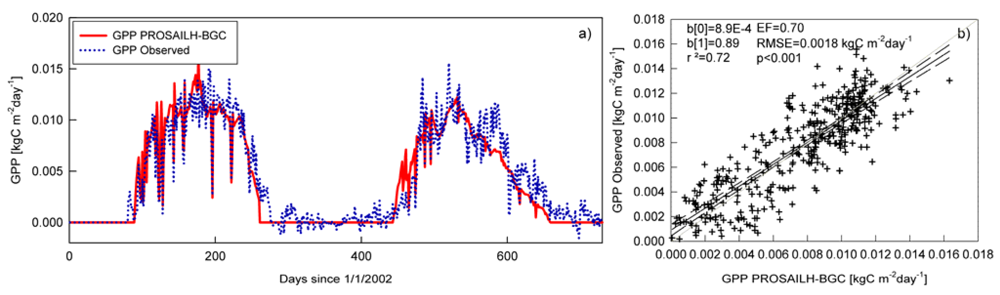 Finally, we evaluated the accuracy of daily GPP modeled by PROSAILH-BGC after two-step optimization. The time courses of daily GPP for 2002 and 2003 are depicted in Figure 6a. Results show good agreement between modeled and observed GPP both at daily (Figure 6b) and yearly (Table 4) time-steps thus underscoring that the proposed approach may be useful in modeling the GPP of poplar plantations.
