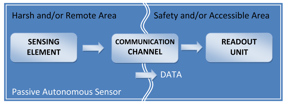 Autonomous sensors can be defined as devices that autonomously execute their measurement functions in the measurement environment. They are also unwired from the acquisition unit; they are characterized by autonomous power supplies and the ability to measure and transmit data. They can achieve different functionalities ranging from simple detectors, giving an alarm signal when the sensor passes a threshold, up to monitoring systems collecting measurement data of different physical or chemical quantities. Autonomous sensors are increasingly used in many applications, mostly in measuring physical phenomena. They can be applied for measurement of quantities both in mobile devices, or in protected environments, or in spaces where electrical energy is absent. Their use widens also to applications where wires connecting a data acquisition unit and the sensor element cannot be used such as, for examples, in implantable devices inside the human body to avoid risk of infections or skin damage [-] in rotating machinery, [], or in hermetic environments []. In the industrial field a cable connection of the machine produces friction, stiffness and damping, limiting movement. The cables can be easily damaged, which affects the reliability of the measurement system. Hermitically sealed bags are essential for dry foods such as potato chips and various types of cereals to retain their freshness and safety. Autonomous sensors can improve the current shelf life labels by letting both consumers and producers know when the packaged food is fresh and safe. In the food logistics field autonomous sensors are related to the product and follow it along all the food chain, acquiring data and registering the crossing of several thresholds in terms of temperature, humidity, light or gas concentrations [-]. In the biomedical field cable connections limit the patient's mobility and, moreover, may cause skin irritations or infections. Some applications of autonomous sensors can be founded in remote monitoring apparatus for the measurement and recording of physiological parameters [-]. Autonomous sensors are applied on live animals for analysis of brain stimulants to analyze neurochemical data for research purposes. These systems are small and light enough to record biopotentials from awake birds and insects. This technique allows, for example, real-time reading of glucose levels in diabetic patients, critical care and brain injuries. In orthopedic science autonomous sensors are used for accurate measurements of knee forces in total knee arthroplasty []. These forces produce wear in polyethylene, stress distribution in the implant and the implant–bone interface, and stress transfer to the underlying bone.