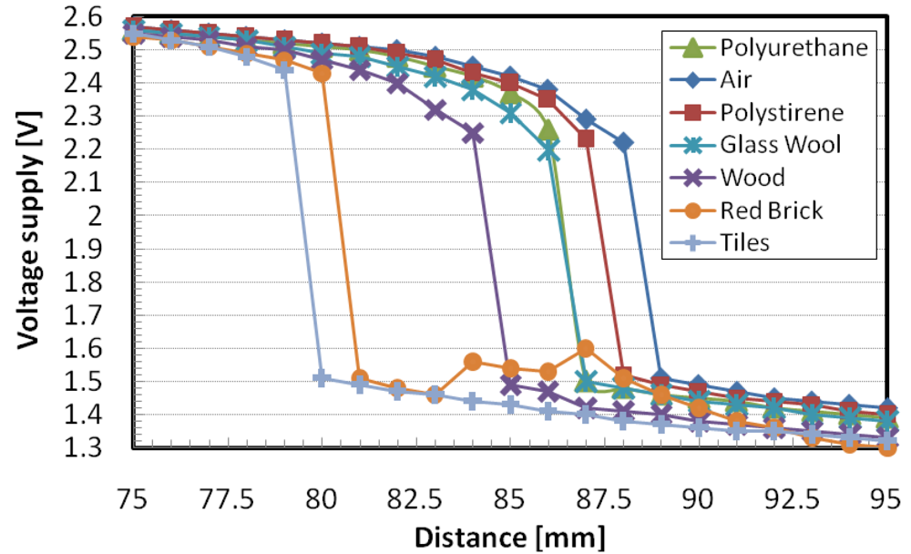 The telemetric communication has been characterized interposing between the readout system and the autonomous sensor layers of different material. Metallic layers have been tested as well, but as expected, they do not permit the communication. The tested materials are: polystyrene (thickness 6 cm), polyurethane (6 cm), wood (4 cm), glass wool (4 cm), red brick (5 cm) and tiles (4 cm). In Figure 11 the voltage generated by the transponder is measured as a function of the distance between the autonomous sensor and remote unit. The normal working operations are executed with transponder voltage supply over 1.8 V. As expected, the air curve presents the highest readout distance, while the other curves present a readout distance of few centimeters less.