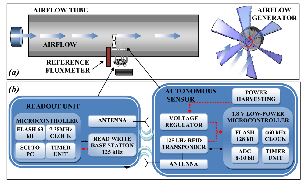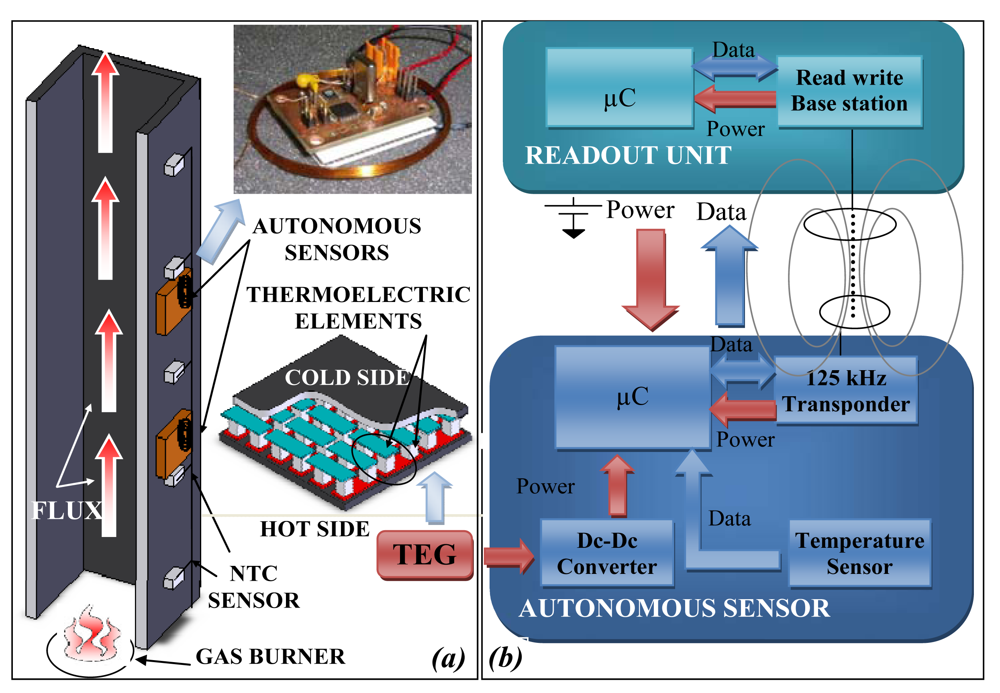 Two self powered autonomous sensors are presented in this paragraph, one measures the temperature and the second the wind velocity. They use a thermoelectric and an electromechanical harvesting system. In the second example the measured parameter is supplied by the same energy used by the power harvester. Temperature values along the section of heating plant are important indicators to control the energy efficiency in the regulation of the thermal comfort [-]. An autonomous sensor system consisting of a low power microprocessor, a 125 kHz RF-ID transponder, a low-power temperature sensor and an energy harvesting module has been developed for temperature measurement of walled-in pipes []. Figure 9 reports in (a) the experimental set-up for the testing of the self-power autonomous sensors, while in (b) the block diagram of the sensor and readout system.