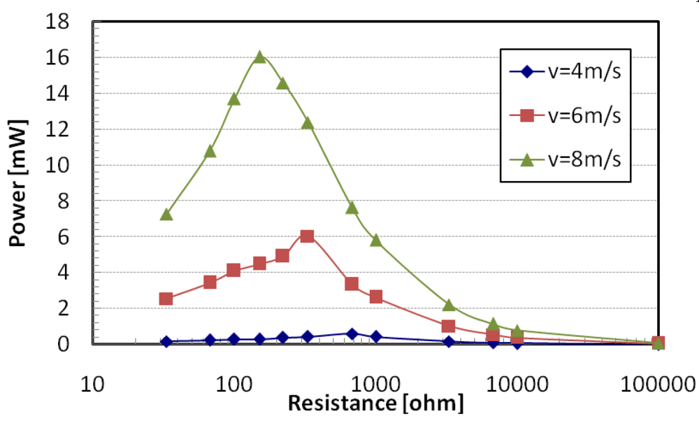This power is function of air density, which can be assumed to be of 1.2 kg/m3 area, and airflow speed. The theoretical maximum quantity of energy for a standard area of 55 cm2 and a wind velocity 4.5 m/s is about 300 mW. A generator module cannot extract all of this power, since the relatively high viscous drag on the blades, the bearing losses and other factors. The wind power is corrected with a power coefficient less than unity (Cp). Large-scale airflow generators can be highly efficient, with power coefficients greater than 0.5 being achievable; for small-scale airflow generators the performance is less good, about 0.1 [].