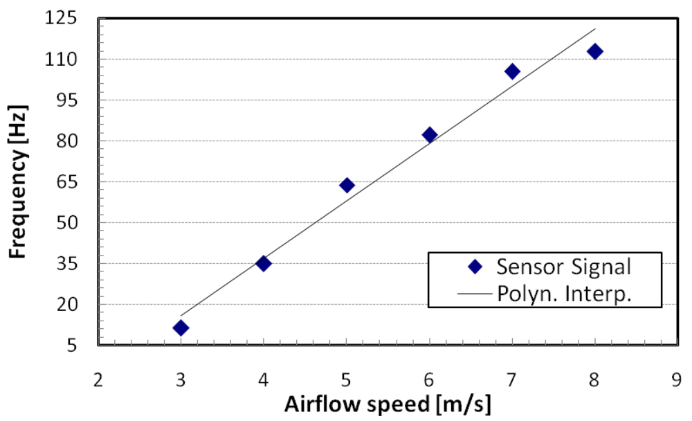 In the proposed application different airflow harvesters using commercial rotor and generator parts have been tested to study the power efficiency as a function of the load. The efficiency obtained was about 0.08. In Figure 13 a maximum power of 16 mW can be observed for a load of 150 Ω by a brushless generator and an impeller of 7 cm diameter. An experimental setup has been arranged to test the autonomous system by measuring the flux inside the pipe and the voltage that can be generated by the airflow harvester. The obtained results have shown a linear behavior of the sensor, as shown in Figure 14. The system begins working for airflow speed higher than 3 m/s, the measured data are stored into a non volatile memory and downloaded to a readout system. Depending on the power supply of the airflow generator, if the flow is not sufficient to supply the autonomous sensor, this can generate a black-out period. For this reason it is not able to record a trace of an absolute time of the measurement.