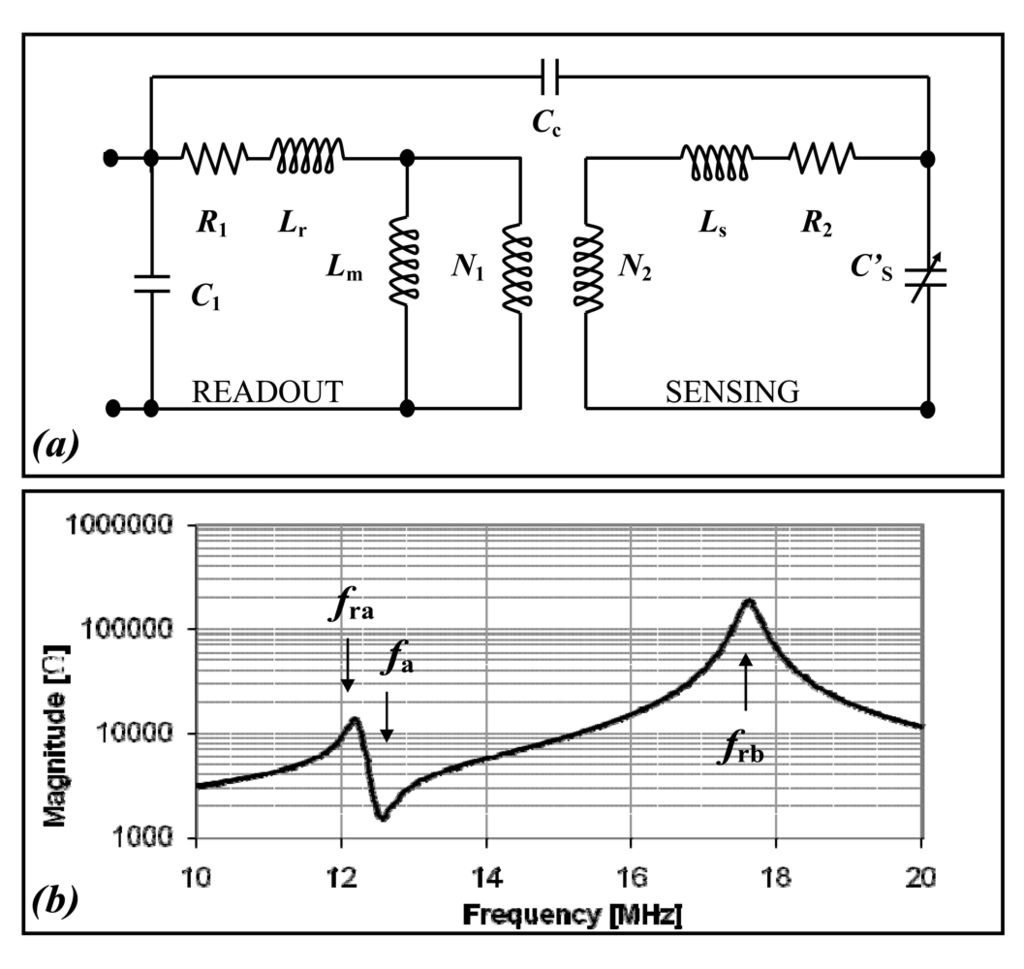 A model of an inductive telemetric system is illustrated in Figure 2(a). The parameters have the following meaning: R1, R2 are the equivalent resistances of readout and sensor; C1, C′S are the parasitic capacitances of the readout and sensor; Lr, Ls are the readout and sensor leakage inductances; Lm is referred to coupled flux; N1 and N2 are the equivalent number of the inductor windings; Cc is the coupling capacitance. The impedance as seen from the terminal of the readout inductance is qualitatively plotted in Figure 2(b), which shows the three resonant frequencies (fra, frb, fa). According to the 3-Resonancies method, the sensor and the parasitic capacitance (C′S) can be calculated by: