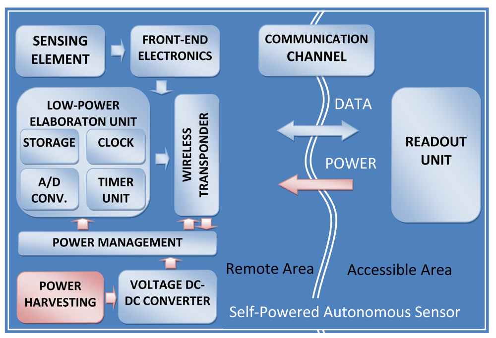 Differently from passive autonomous sensors, self-powered autonomous sensors are autonomous devices having the capability and functionality of a stand-alone measurement unit, even if the readout unit is not close. Self-powered autonomous sensors should be able to execute measurements, store the measurement data and send these values to the readout unit. In literature examples of self-power autonomous sensors are being increasingly reported. Many examples [, , ] use batteries as the power source. In [], physical and chemical sensors for logistic data-logging applications to evaluate food quality and freshness are discussed. In [] recent results of autonomous sensor research for brain stimulation and neuronal activity recording are reported. In [] an autonomous sensor monitored patient vital sign data in a hospital. Other examples of autonomous sensors that do not use batteries are quoted in [-, -]; all the internal modules are supplied by a power harvesting module or by the electromagnetic field of a wireless link. Since the possibility of substituting batteries with harvesting system is greatly attractive from an ecological point of view, our analysis will be concentrated only on autonomous sensors equipped with harvesting systems. These self-powered autonomous sensors consist of one or more sensing elements and different modules: front-end electronics, an analog-to-digital converter, an elaboration unit to manage the internal tasks, power management, a wireless transceiver and storage memories. In Figure 3 a block diagram of a self-power autonomous sensor is shown. Common characteristics can be extracted: very low-power design, stand-alone configuration, minimal control and communication circuits in order to achieve the smallest and most easily attachable form.