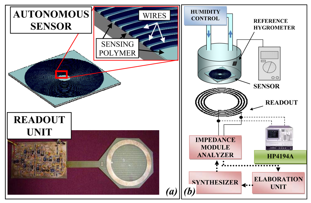 Measurements of relative humidity (RH) in hermetic environments, for example in logistic and biomedical fields, can be executed wirelessly by passive autonomous sensors. In Figure 4(a) an example of autonomous sensor and readout system for this application are schematically represented.