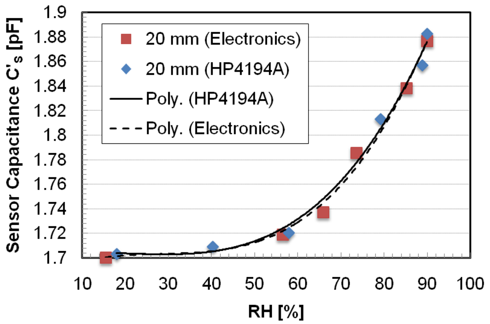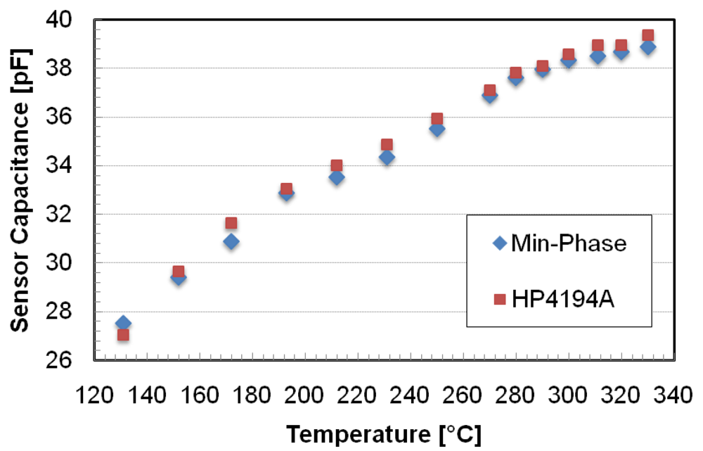 In Figure 8 the sensor's capacitance measured at 2 MHz is reported as a function of the temperature: square points are the values directly measured on the sensor terminals, while the others are measured from the external inductor and calculated using the Min-phase method []. The diagram shows a quasi linear behavior of the sensor. The values calculated with the Min-phase method are closely to the reference one measured with the impedance analyzer (HP4194A).