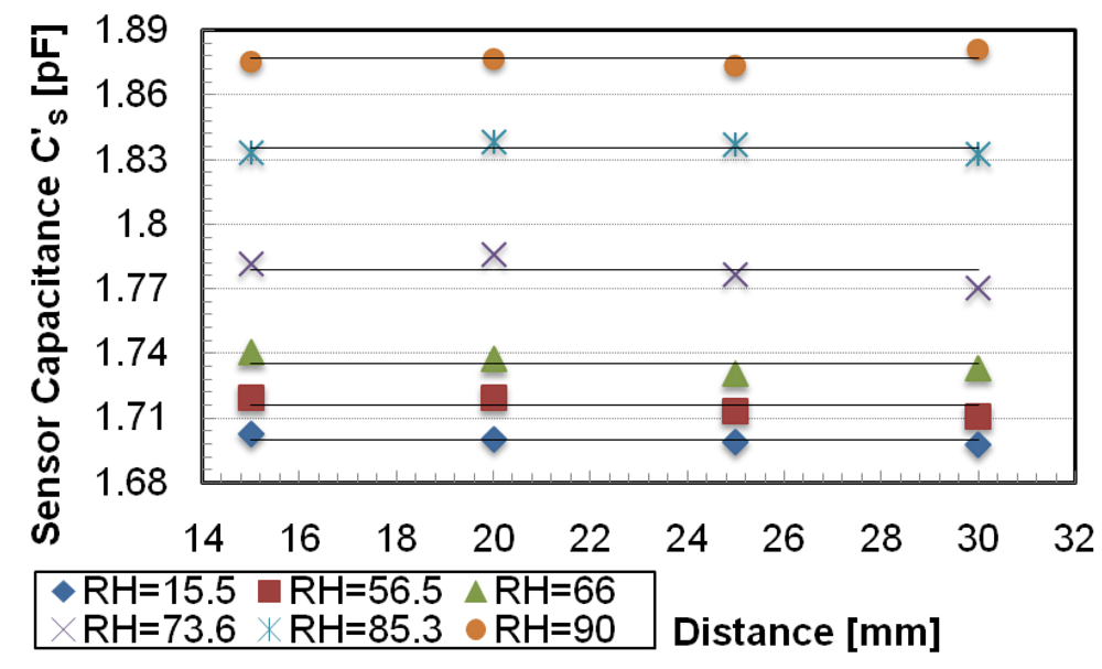 Capacitance values calculated using the proposed conditioning electronics as a function of RH and distance.