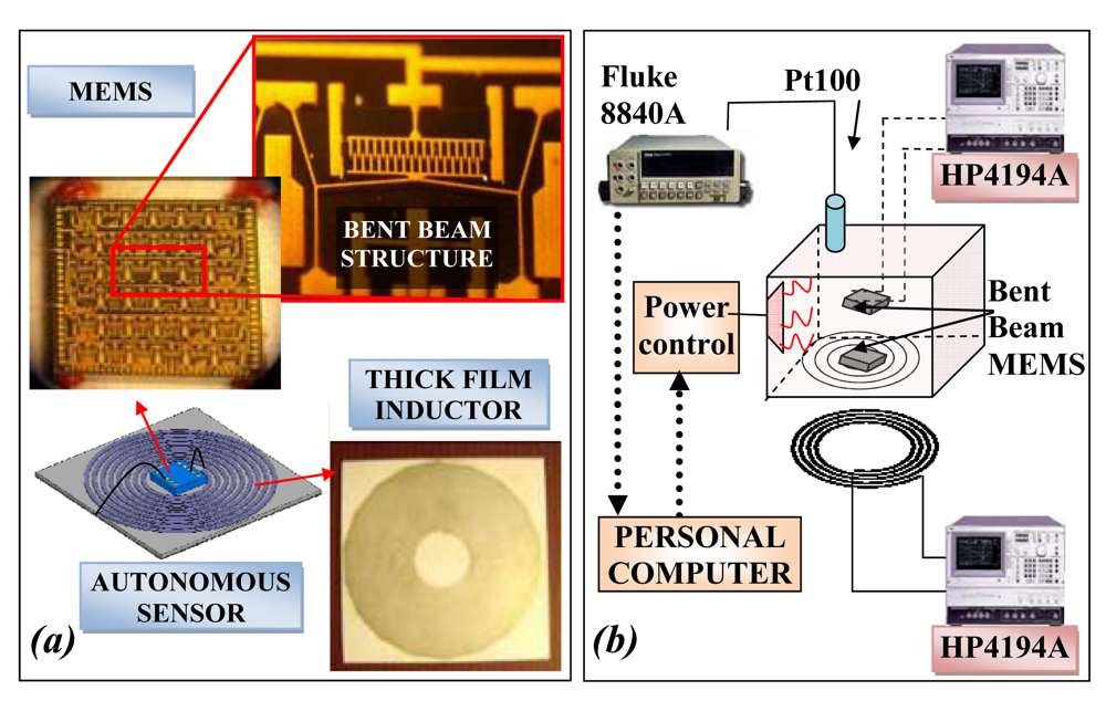 A passive autonomous sensor for high temperature measurement is represented schematically in Figure 7(a): the sensor is a hybrid MEMS composed by a novel MEMS temperature sensor (above in Figure 7a) developed using the Metal MUMPs process [] and a planar inductor (below in Figure 7a) realized in thick film technology by screen printing over an alumina substrate a conductive ink in a spiral shape.