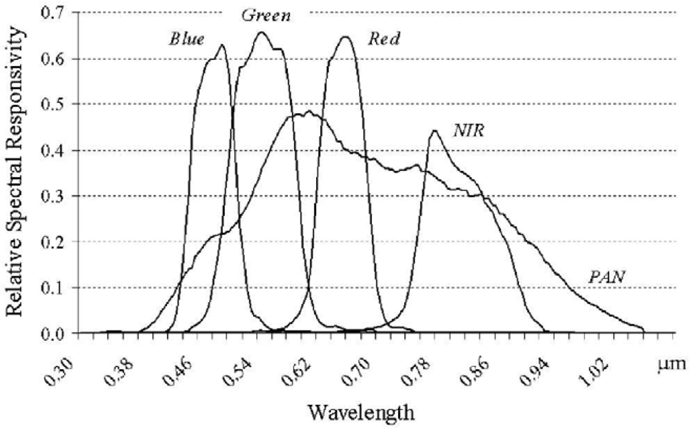 Spectral response functions for QuickBird-2 bands.