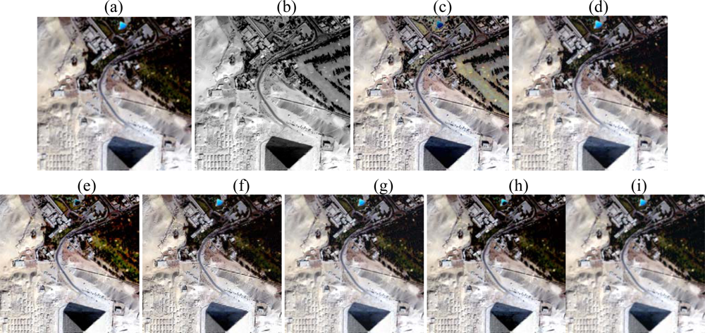 From Figures 4(c)–(i), it can be found that the HRMIs [Figures 4(c) and 4(e)] produced by the IHS and BT methods show obvious spectral distortion; the HRMIs [Figures 4(d) and (f)–(h)] produced by the AWT, DWT, HPF, and HPM methods show second color distortion; the HRMIs [Figure 4(i)] produced by the proposed method show the least spectral distortion. It can be concluded from Figure 4 that the HRMIs [Figure 4(i)] produced by the proposed method appear the best among the HRMIs, and the integration of spatial features and color is natural. This effect can be seen clearly in Figure 5 by enlarging a region of interest. For the IHS and BT methods, this is due to the fact that all details contained in the HRPI are directly injected into the LRMIs []. For additive methods, such as AWT, HPF, and HPM, this is probably due to over enhancement along the edge area because these methods have not considered the differences in high frequency information between the HRPI and the LRMIs []. For the DWT method, the critically sampled multiresolution analysis does not preserve the translation invariance [].