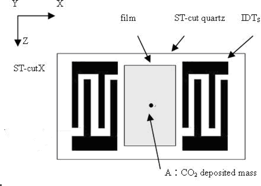 Owing to its many advantages of high sensitivity, simplicity, low cost and ability to perform rapid measurements, the piezoelectric quartz crystal resonator has been widely used as a mass sensitive detector in electrochemical experiments recently. The application of an alternating electrical field perpendicular to the surface of the piezoelectric quartz crystal (PQC) induces a mechanical vibration of the piezoelectric surface, whose frequency is changed by loading effects generated when a small mass is deposited on the resonator surface [1–3]. Previous studies have shown that surface acoustic wave (SAW) sensors provide a superior resolution than quartz crystal microbalance (QCM) devices due to their higher operating frequencies of 100 to 200 MHz. SAW delay-line sensors have attracted particular attention since they are characterized by high sensitivity, up to 10−9 ∼ 10−15 g, a rapid response, low cost, small physical size, and a straightforward fabrication process [4,5]. The output response of the SAW device varies as a linear function with the input signal, which corresponds to the deposited mass, and some researchers have successfully optimized their mass sensitivity by considering the calibration curve of device response versus mass concentration [6–8].