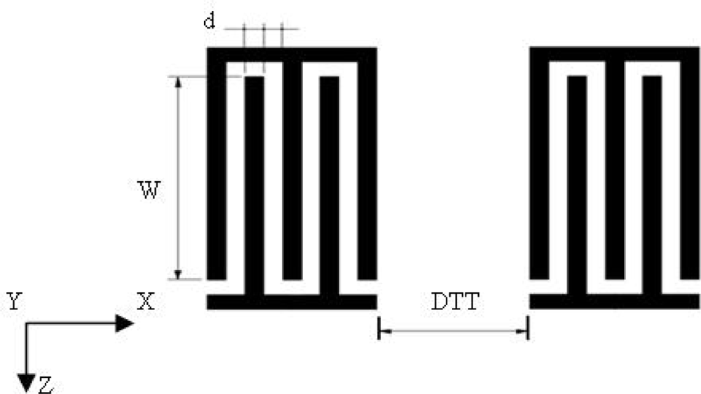 Surface acoustic wave sensors are highly sensitive to mass changes on their surfaces. Even the deposition of a small mass on the surface of ST-cut quartz crystal in air causes a reduction of its original resonant frequency as shown in Figure 1. This frequency shift is proportional to the deposited mass per unit area of the sensing film. Ignoring oscillation circuit stability considerations, the higher the resonant frequency of the device leads to the smaller the mass variation is capable of detecting. SAW delay-line type devices are used in many mass-sensing applications. The Rayleigh wave type can be excited using an interdigital transducer (IDT). In this technique, the spatially periodic field of the IDT produces a periodic mechanical strain pattern [16] which causes acoustic waves to propagate away from either side of the IDT in a direction essentially perpendicular to the interdigital alignment of the transducer electrodes. As shown in Figure 2, the delay-line device consists of two IDTs with a constant electrode overlap, w, and a separation distance, L, implemented on an ST-cut quartz piezoelectric substrate. The operating resonant frequency of a SAW sensor is strongly related to the period of the IDT transducer. The IDT operates most efficiently when the acoustic wavelength of the SAW matches the transducer period.