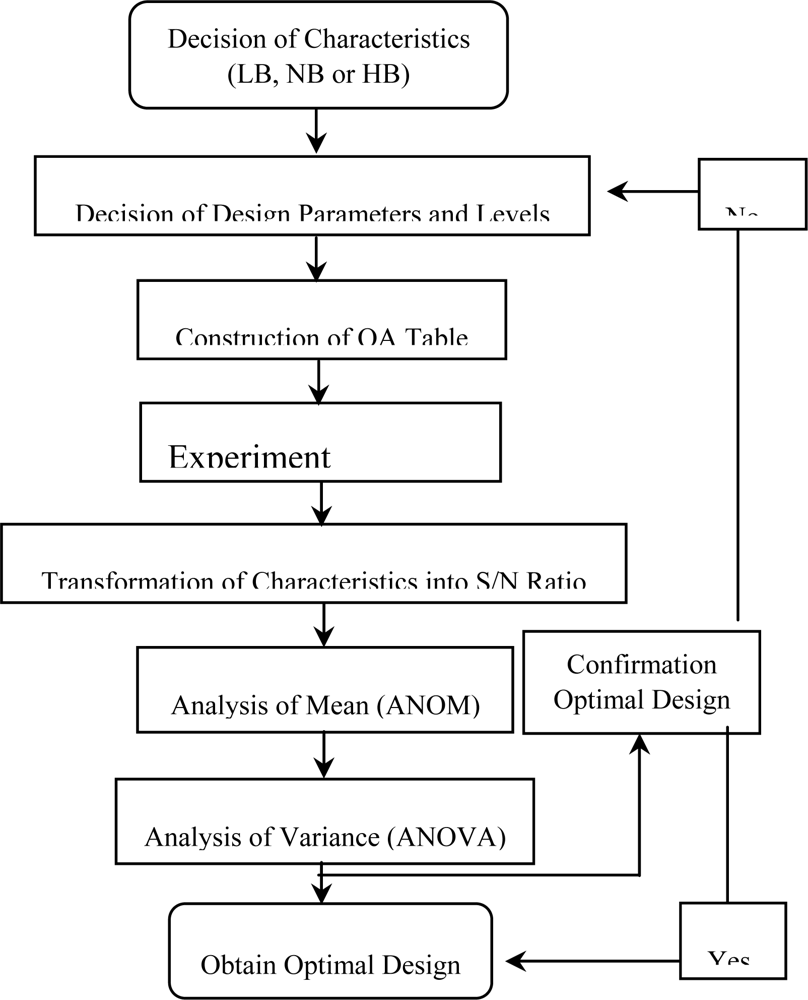 In the SAW design, the frequency shift value is treated as the characteristic value and is ideally as large as possible in order to enhance the detection capabilities of the device. Therefore, the present robust design case is defined as a dynamic larger-the-better problem and the main objective of the design activity is to maximize the S/N ratio defined in Equation (3). Figure 3 presents the robust design procedure adopted in the present study. Meanwhile, Table 1 presents the specified SAW control factors and their respective level settings. This study adopts an L18(21×37) orthogonal array as Table 2, which is known to be less affected by interactions between the various design parameters. In a parameter design experiment, the control factors are assigned to an inner array, while the signal factor and noise interference factors are configured in an outer array. In the present study, the outer array consists of a signal factor with three levels, i.e. deposited mass values of: M1: 3.5728×10−9 g, M2: 3.5728×10−8 g, and M3: 3.5728×10−7 g, crossed with a three-level noise factor, i.e. N1 = 41.750, N2 =42.750, and N3 = 43.750, where N is the cut angle of the quartz. It is noted that these noise factors represent the dimensional errors in quartz crystal cutting angle introduced during manufacturing.