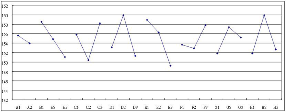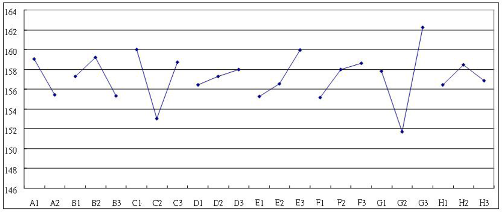Having identified the factors which have a significant influence on the S/N ratio and sensitivity, appropriate settings of each design parameter must be chosen in order to reduce the variability and increase the sensitivity. However, if the design objective is to maximize the device sensitivity β and reduce variability, then from Figure 7 and Figure 8, the appropriate factor level settings are A1B2C1D2E1F3G3H2. It can be seen that there is a contradiction between these two sets of results, and hence some degree of compromise is necessary. Of the five control factors, factor F can be considered as an adjustable factor whose setting is dependent on economic or manufacturing considerations.