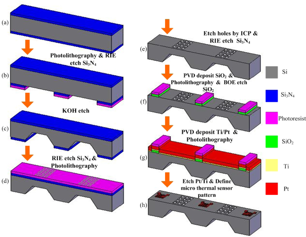 As a soft and silvery-white metal, Pt is extremely malleable [14], and has a resistance that varies linearly over a large temperature range of −260–1,000 °C. Even when the ambient temperature exceeds 1,000 °C, it remains stable and does not undergo significant physical or chemical changes. The error range is at minimum ±0.06 % (or ±0.15 °C) at 0 °C. Notably, Pt cannot be etched in strong acid or alkali, with the exception of aqua regia. Therefore, Pt is the material of choice for thermal sensors.