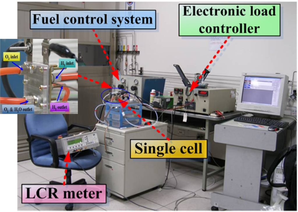 In this experiment, the temperature of micro thermal sensor was measured and ranged from 25–45 °C. Hydrogen flowed on the anode side and oxygen flowed on the cathode side. Hydrogen and oxygen flows rates were 10 and 30 SCCM. The humidify parameter was increased from 20 °C to 40 °C. The active area of the fuel cell was 1.82 cm2 (1.3 cm×1.4 cm). The proton exchange membrane was obtained from Ion Power Co. The Pt loading was 0.5 mg/cm2. Figure 4 presents the experimental setup for calibrating the micro thermal sensor, and measuring resistance using a 4230 LCR meter. The frequency of the LCR meter was 1 kHz; the meter used a 4-terminal probe connection. In fuel cell performance tests, the fuel cells were connected to the fuel control system; the electronic load controlled the fuel feed rate, and the experimental setup for measuring fuel cell performance is shown in Figure 5.