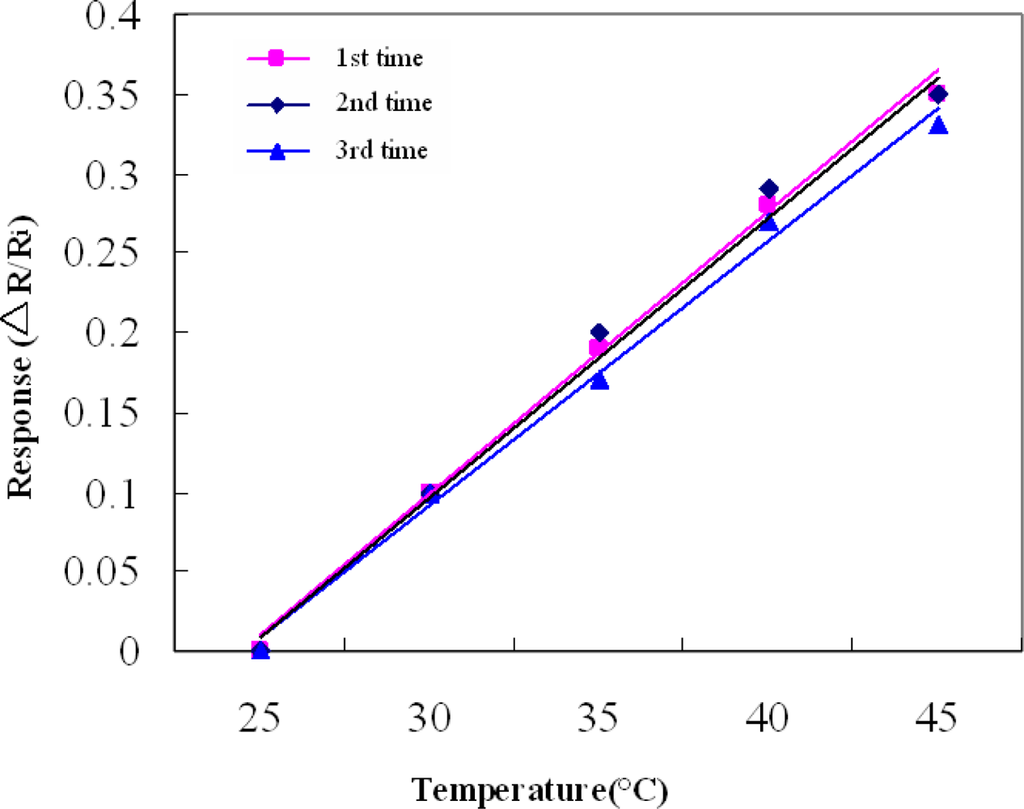 Experimental results indicate that temperature was almost linearly related to resistance. Accuracy and sensitivity of the micro thermal sensor were 0.5 °C and 1.68×10−3/°C, respectively. Micro thermal sensor accuracy was defined based on temperature in the accuracy range (0.5 °C) of the programmable temperature chamber. Figure 6 shows the normalized temperature response of the micro thermal sensor, and the sensor was measured three times, and these response curves were very coincidental and had high reproducibility; standard deviation was 0.037212. Experimental data reveal that temperature was almost linearly related to resistance. Fuel cell temperature during operation was 27 °C, as measured using thermocouple in contact with the electrode backside. Temperature measured in situ during fuel cell operation was 30.5 °C.