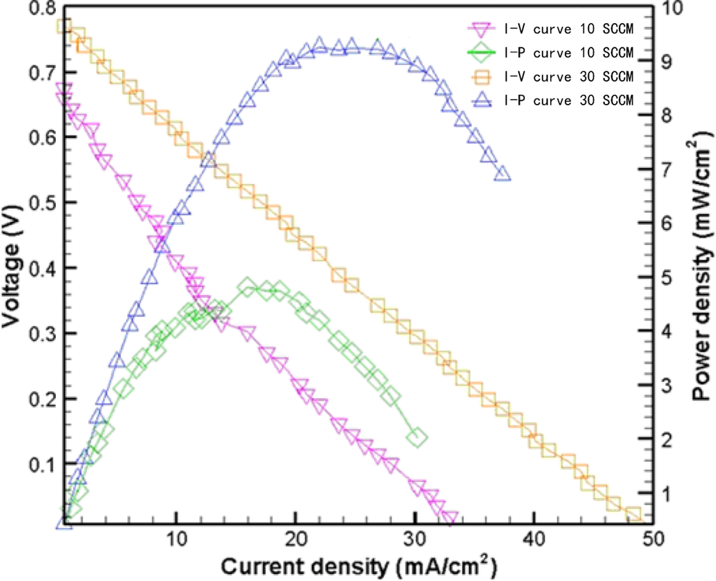 Performances of the fuel cell with 10 μm holes were compared under the following operating conditions: (a) at 15 °C (with no humidity) and 20 °C, 30 °C, 40 °C (with humidity); (b) hydrogen and oxygen flows rates at both 10 and 30 SCCM; and (c) without and with a micro thermal sensor at 15 °C (no humidity) and a flow rate of 30 SCCM.