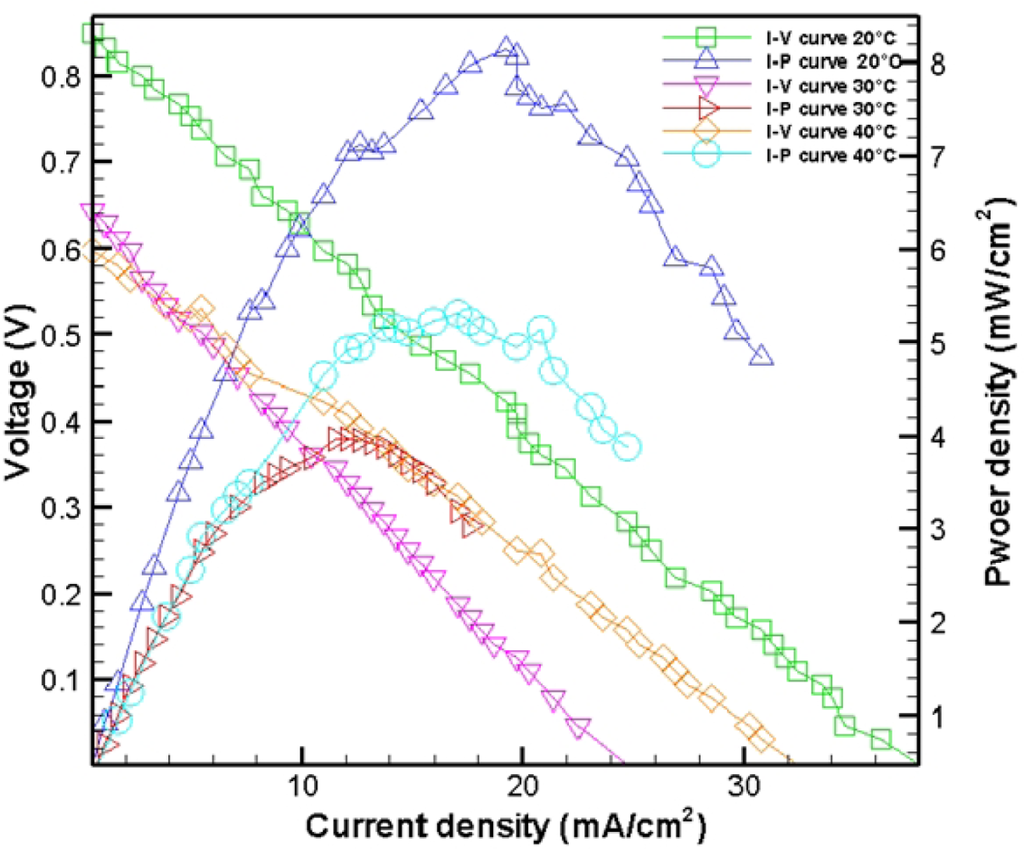 Figure 7 presents experimental results with 10 μm holes at 15 °C (no humidity) and flow rates of 10 SCCM and 30 SCCM. The maximum power density was approximately 9.25 mW/cm2, with a flow rate of 30 SCCM. Figure 8 shows experimental results obtained with 10 μm holes at 20 °C, 30 °C, 40 °C (humidity) and a flow rate of 30 SCCM. The maximum power density was approximately 8.13 mW/cm2 at 20°C. Figure 9 compares the performance obtained without a micro thermal sensor with that obtained with a micro thermal sensor on the anode electrode at 15 °C (no humidity) and a flow rate of 30 SCCM. The maximum power density of the fuel cell without and with a micro thermal sensor on the anode electrode was 9.37 mW/cm2 and 2.15 mW/cm2, respectively. Notably, the local temperature could be measured because a micro thermal sensor has an insulating layer on both sides, explaining why the insulated area likely decreased the reaction area and fuel cell performance. Table 1 summarizes the experimental results for Figure 7 to 9.