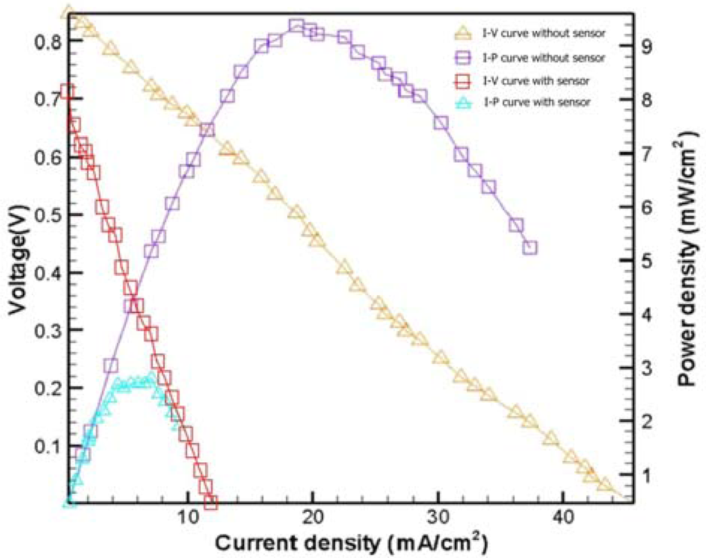 Performance results with 10 μm holes in the fuel cell without and with a micro thermal sensor at 15 °C (no humidity) and flow rate of 30 SCCM.