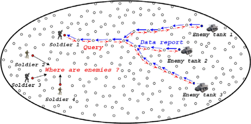 A sensor network example. Soldiers use the sensor network to detect tank locations.