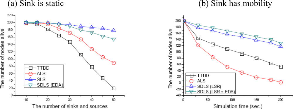 Figure 10 (b) depicts the network lifetime according to the simulation time from 0 to 200 seconds. Sink speed is 10 m/s and the number of sinks and source nodes is 15, with an initial energy of 1J. Since SDLS distributes data over the entire network by considering residual energy, the network lifetime could be significantly prolonged compared to the other protocols. The network lifetime for both SDLS (LSR) and SDLS (LSR + EDA) is longer than other protocols.