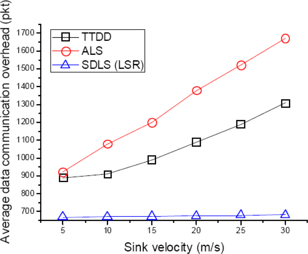 In order to evaluate the average data communication overhead, we vary the velocity of the sink from 5 m/s to 30 m/s in increments of 5 m/s. Each source node generates a data packet 10 times. In other words, Figure 11 shows that after finishing location service, data packets are sent by multi-hop transmission. We can see that average data communication overhead is the highest with ALS. TTDD consumes less overhead than ALS. This is because TTDD can find a new path by updating to a new grid node. However, this is not the shortest path. Therefore SDLS performance is the best.