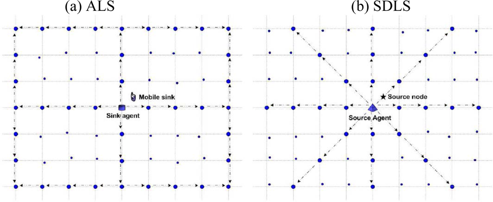 Perhaps the most similar protocol to SDLS is the Anchor Location Service (ALS) protocol [23]. ALS is a grid-based protocol that provides the location information of the sink. ALS constructs a single global grid structure, assigning the sensors nearest the grid points as grid nodes. The sink selects the nearest grid node as its sink agent to distribute its location information. At the beginning of the process, the sink agent sends out four anchor setup messages in four straight orthogonal directions (North, South, East, and West) and all the grid nodes that lie along the routing path are recruited as anchors. Once an event occurs, the source node will register with the nearest grid node, known as the source agent. The source agent will then send four location query packets to find the location of the sink agent. It then receives the location of the sink agent. The source node finally sends the data packets to the sink agent using GPSR protocol. However, it is difficult to identify the location of a moving sink. The following problem occurs when the sink constructs an anchor system. First, the source node cannot identify the location of the sink if the sink does not construct an anchor system. Second, the sink has to wait until the sensor node detects the event. Third, when the sink has high mobility, the sink agent has to relay the data from the source node to the sink. Thus, the distance between the source node and the sink may increase significantly when a detour occurs. ALS also suffers from concentrated energy consumption because it always uses border nodes when it provides the sink location. Therefore, it is necessary to propose an energy efficient protocol to balance sensor node energy consumption.