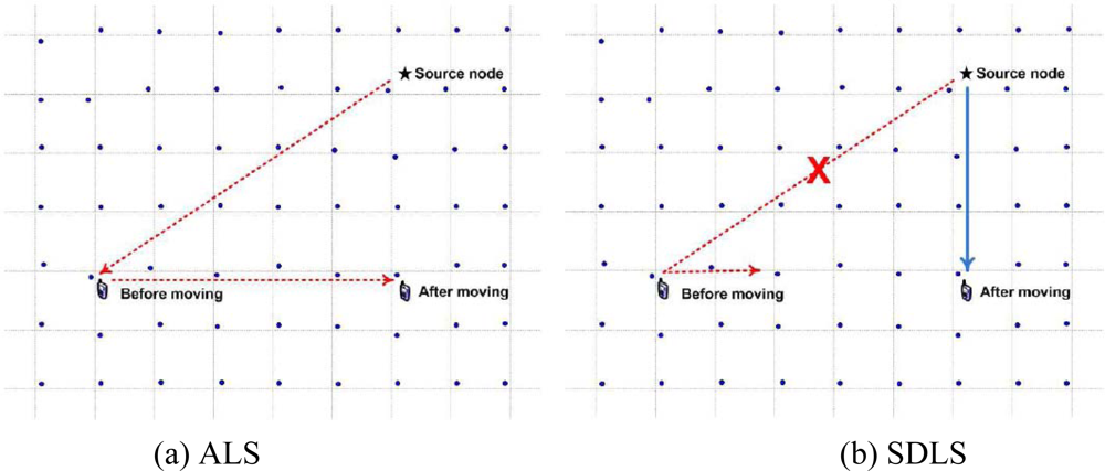 To address this problem, we provide source node’s location in the WSNs [see Figure 2(b)]. A significant difference between our proposed scheme and the traditional mobile sink supporting scheme is that the source node provides its location service server. Therefore, it is necessary to propose an energy efficient location service protocol to balance sensor node energy consumption.
