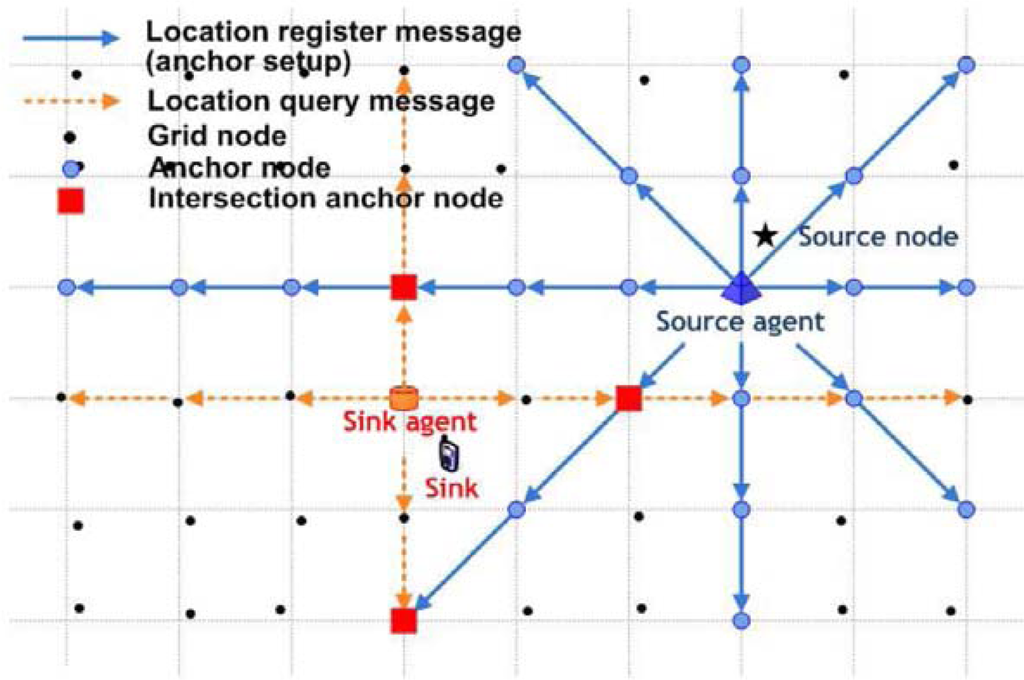 - The sink can obtain the location of source nodes from the location response at intersecting anchor nodes (Figure 4).