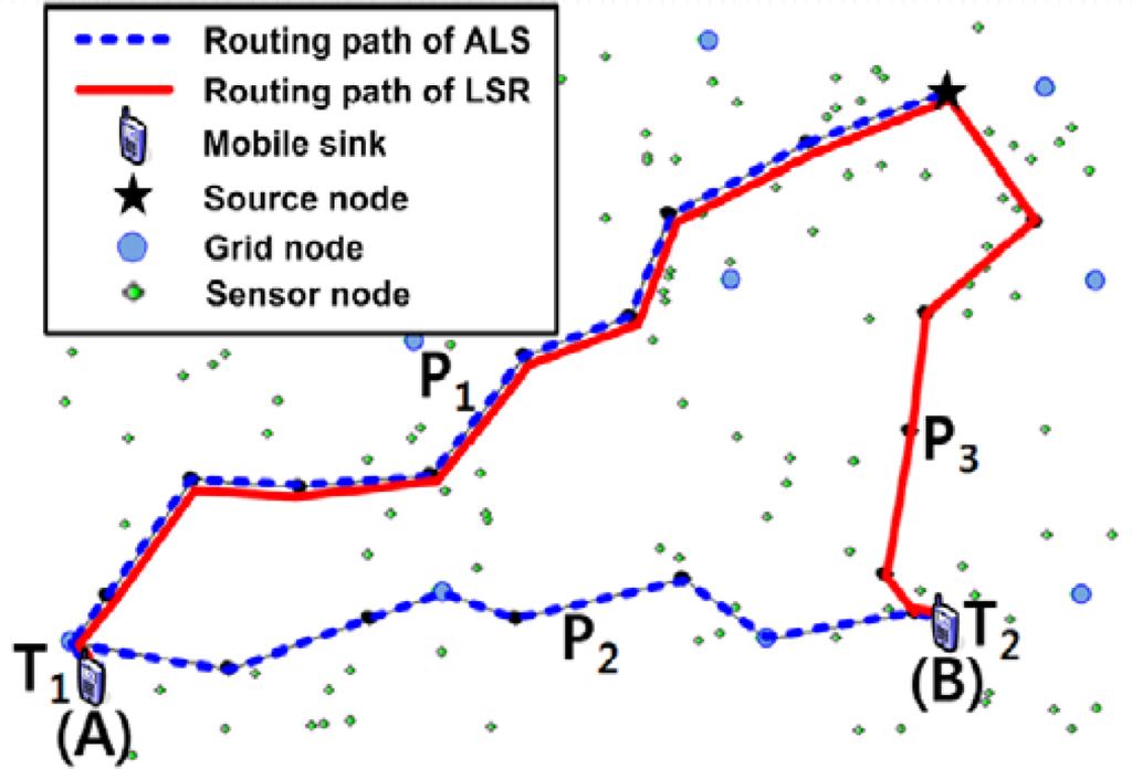 An example of the comparison of ALS and LSR to support sink mobility and data forwarding (extracted result from the simulator). Routing path of ALS and LSR = P1 (same) on point A, Routing path of ALS = P1 + P2 and LSR = P3 on point B.