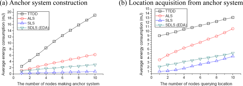 Figure 6(b) shows the average energy consumption when nodes send a location query to find nodes to make an anchor system. Here, we consider that there are four nodes making the anchor system. TTDD requires more energy than the other protocols to make an anchor system; we can see that TTDD consumes more energy than the other protocols. TTDD also has to find the location of source nodes per each source node. However, both SDLS and ALS find node locations using global grid nodes with low energy consumption. The anchor system of ALS concentrates location information on border nodes. Thus, it frequently reaches the border nodes to obtain location information. Therefore, SDLS can obtain location information faster than ALS. As shown in the figure, we can see that ALS’s energy consumption increases faster than for TTDD. In TTDD, a sink finds four fixed source nodes. If the sink must find more source nodes, the protocol will consume more energy. As in forming the anchor system, SLS has the least energy consumption. However, the energy consumption of SLS increases gradually with the number of nodes querying location if no the sensor node is located on the crossing point or one query message fails.