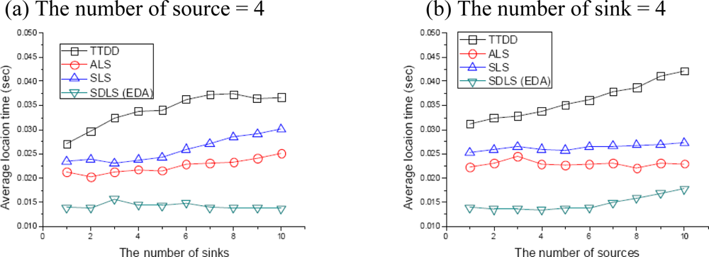 In order to evaluate the average location response time of multiple sources, we fixed the α = 200 m and varied the number of sources from 1 to 10 in steps of 1. In SDLS, from Figure 7(b), it can be seen that the location time slightly increases with the number of source. This is because when multiple sources are deployed in the network, location query messages always have to travel until they find all source’s location information. However, until source nodes are 10, SDLS is less time than ALS to get location information. TTDD is also same that the location time increases with the number of source nodes.