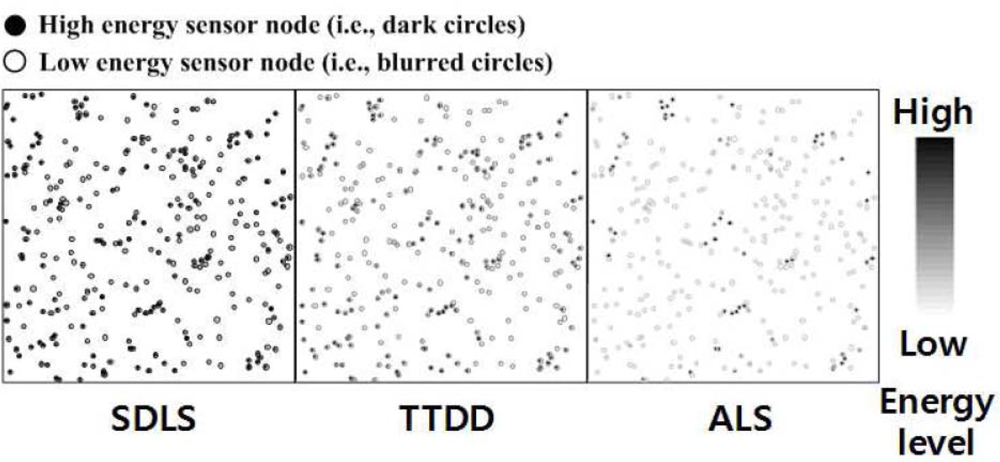 ) compared with ALS. EDA prevents intensive energy consumption at the border sensor nodes; consequently, the energy consumed is well balanced for all the sensor nodes.